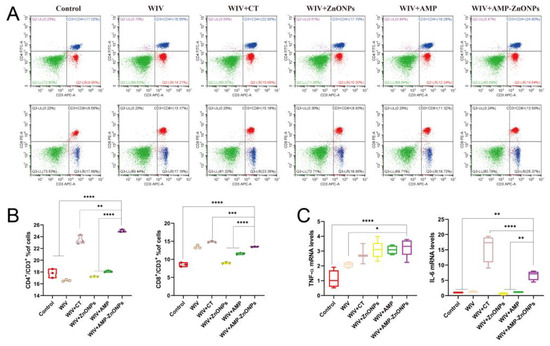 Flow cytometry plots images of CD4+/CD3+ and CD8+/CD3+ T cells in various groups (A). Statistical analysis of CD4+/CD3+ and CD8+/CD3+ ratio (B). The levels of cytokines TNF-α and IL-6 in jejunum tissue from immunized mice 28 days after primary immunization were determined by qRT-PCR (C). *, **, *** and ****, respectively, indicate p < 0.05, 0.01, 0.001 and 0.0001, compared to the WIV + AMP-ZnONP group.