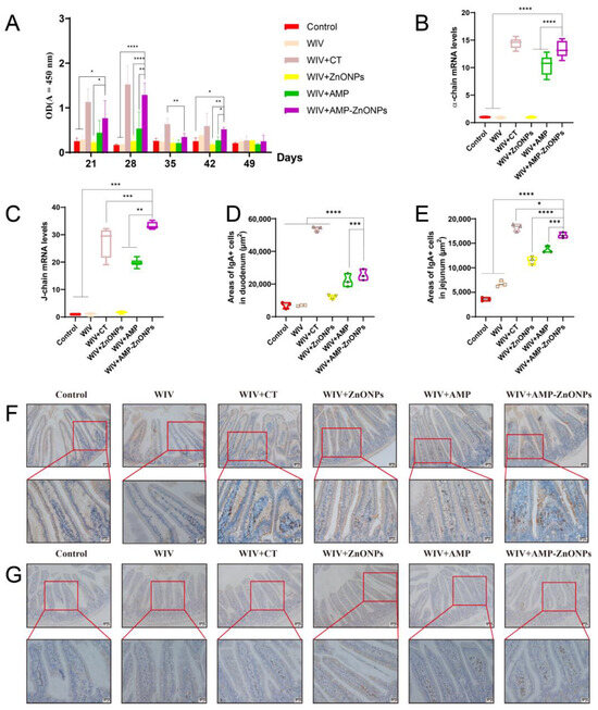 The mucosa IgA titers in the intestinal wash were detected at different time points by ELISA (A). The mRNA levels of α-chain (B) and J-chain (C). Changes in the area of IgA-secreting cells in the duodenum (D) and jejunum (E). IgA-secreting cells of the duodenum (F) and jejunum (G) 28 days after primary immunization were observed by IHC. *, **, *** and ****, respectively, indicate p < 0.05, 0.01, 0.001 and 0.0001, compared with the WIV + AMP-ZnONP group.