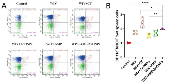 CD11c and MHCII staining were utilized to identify DC subpopulations in the spleen by flow cytometry (A). Flow histograms were employed to compare the characteristics of the DC subpopulations (B). *, ** and ****, respectively, indicate p < 0.05, 0.01 and 0.0001, compared to the WIV + AMP-ZnONP group.