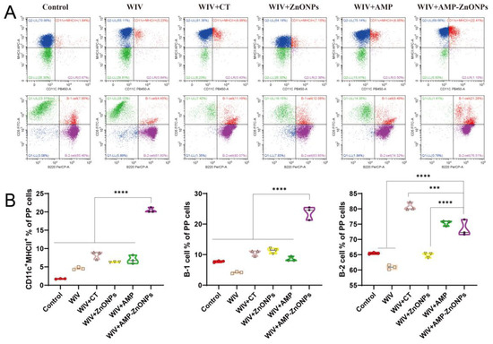 Flow cytometry was performed on single-cell suspensions from PP to identify DC subpopulations using CD11c and MHCII staining, and B-cell subpopulations were identified using CD5 and B220 staining (A). Flow histograms were used to compare the DC subpopulations and B-cell subpopulations (B). *** and ****, respectively, indicate p < 0.001 and 0.0001, compared with the WIV + AMP-ZnONP group.