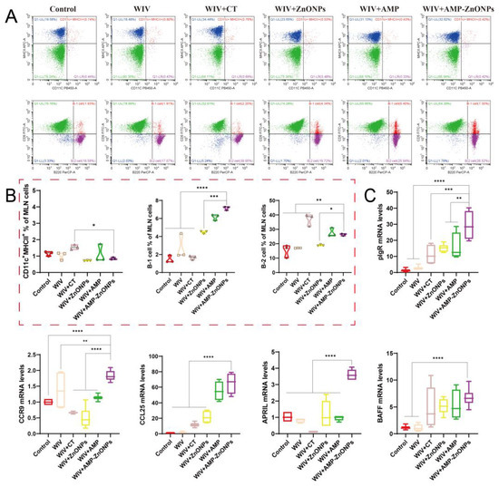 Flow cytometry analysis of DCs and B cells in MLN of immunized mice. The dot plots presented demonstrate the identification of CD11c+MHCII+ DCs and the numbers of B-1 and B-2 cells (A), and they are shown in the corresponding histograms (B). The mRNA levels of pIgR, CCR9, CCL25, APRIL and BAFF (C). *, **, *** and ****, respectively, indicate p < 0.05, 0.01, 0.001 and 0.0001, compared to the WIV + AMP-ZnONP group.