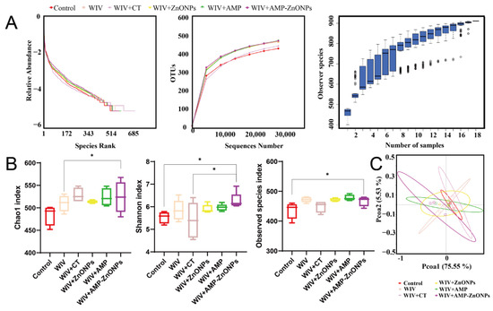 Rank abundance curve, dilution curves and species accumulation boxplot were generated for multiple mouse samples (A). The alpha diversity indices including the Chao1 index, Shannon index and observed species index were calculated (B). Beta-diversity analyzed by principal coordinates analysis (PCoA) (C). * indicates p < 0.05, compared with the WIV + AMP-ZnONP group.