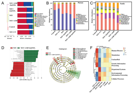 Beta-diversity measured by cluster tree of gut microbiota (A). Mean abundances at the phylum (B) and family level (C) in fecal microbiota of different groups. The LDA scores calculated at the species level between the WIV and WIV + AMP-ZnONP groups (LDA score ≥ 3.0) (D). LEfSe evolution branch diagram between WIV and WIV + AMP-ZnONPs (E). The cluster heatmap of functional predictive by Tax4Fun (F).