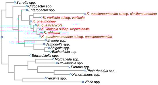 Phylogenetic tree of members of the family Enterobacteriaceae based on 16S rDNA sequences. Members of the Klebsiella pneumoniae species complex are in red. Diagram was generated for graphical information display using 16S rDNA sequences of Serratia marcescens strain Gol3 (ID: MT263018.1), Citrobacter freundii strain S12 (ID: MW879533.1), Enterobacter cloacae strain ATCC 13047 1 (ID: NR_102794.2), Klebsiella quasipneumoniae subsp. similipneumoniae strain CW-D 3 (ID: NR_132596.1), Klebsiella variicola strain 13450 (ID: CP026013.1), Klebsiella pneumoniae strain DSM 30104 (ID: NR_036794.1), Klebsiella quasivariicola strain KPN1705 (ID: OQ719747.1), Klebsiella variicola subsp. tropicalensis strain VITGAJ4 (ID: MT829337.1), Klebsiella africana strain SB5857 (ID: MK040622.1), Klebsiella quasipneumoniae subsp. quasipneumoniae strain 01A030 (ID: NR_134062.1), Erwinia amylovora strain S34 (ID: OP512541.1), Salmonella enterica strain 16OCT84 (ID: OQ581800.1), Shigella dysenteriae strain ATCC 13313 (ID: NR_026332.1), Escherichia coli strain Gol11 16S (ID: MT263026.1), Edwardsiella tarda strain KC-Pc-HB1(ID: CP023706.1), Morganella morganii subsp. morganii strain 229813 (ID: CP043955.1), Providencia stuartii strain ATCC 29914 (ID: NR_024848.1), Proteus vulgaris ATCC 29905 (ID: NR_115878.1), Photorhabdus asymbiotica strain ATCC 43951 (ID: Z76754.1), Xenorhabdus nematophila strain DSM3370 (ID: NR_119150.1), Yersinia pestis strain SCPM-O-B-6291 (ID: CP045163.1), and Vibrio cholerae strain RC782(ID: ON849168.1).
