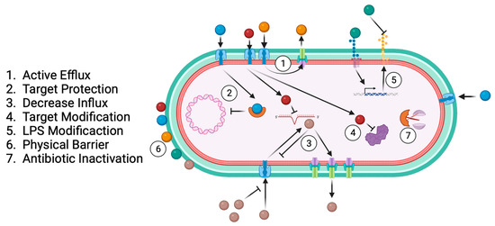 Antibiotic resistance results from bacterial specialisation across time and exposure to different drugs as a bacterial survival strategy [55,56,57]. The main antibiotic-resistance-associated mechanisms are active efflux, target protection, decreased influx, target modification, LPS modification, physical barrier, and antibiotic inactivation (Figure 4).