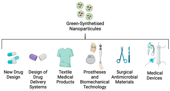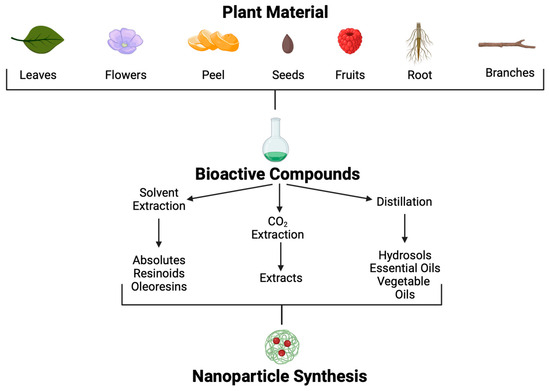 NPs are solid colloidal particles with a 10–1000 nm size range that can offer many benefits [142]. In the biomedical area, NP design focuses on developing new drug delivery materials, photoablation therapy, hospital equipment, and medical clothes that can be valuable tools for controlling the spread of nosocomial diseases [143]. NPs are created by green synthesis technology, which allows the production of these materials to be non-hazardous, eco-friendly, and cost-effective [144]. NPs can be biosynthesised using plant-origin compounds such as extracts and oils (Figure 4).