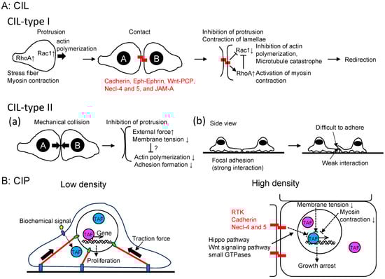 Significantly, these recent findings emphasize the existence of overlapping as well as independent pathways between CIL and CIP (Figure 2). Nevertheless, it is noteworthy that the stretching of dense cells alone can lead to YAP1’s nuclear localization [61], indicating that cell–cell contact alone is inadequate to retain YAP1 in the cytoplasm. In addition, tissue confinement (i.e., cell volume) also determines YAP1 localization and cell growth [71].