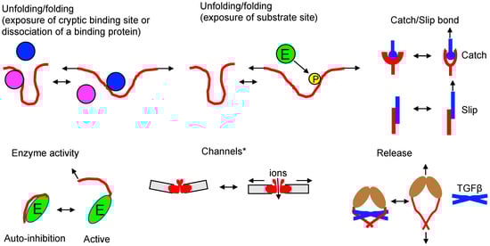 Unfolding-folding—Force-induced conformational changes can expose a cryptic binding site or dissociate a binding protein. During the conformational changes of the protein (red), some proteins (magenta) may dissociate, while others (blue) may bind to the exposed binding site. Additionally, unfolding of the protein (red in the upper middle) may also expose the substrate site (E: enzyme, P: phosphate group). Examples include talin [96,97,98], filamin [99,100], vinculin [101], alpha-catenin [102,103], alpha-actinin 1 [104], lamin A/C [105], von Willebrand factor [106,107], fibronectin [108,109,110]) or substrate site (phosphorylation of p130Cas [111,112], FAK [113], PDZ proteins [114].