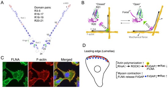 FLNA-mediated mechanotransduction. (A) The structure of FLNA includes paired domains that may undergo unfolding in response to mechanical forces [99,203]. (B) Mechanical force induces conformational changes in the FLNA molecule, exposing cryptic binding sites and altering the geometry of FLNA subunits (e.g., A: FilGAP, B: integrins). (C) FLNA and F-actin are highly concentrated at the leading edge of the cell. 100 × 100 μm. (D) The model proposes that cell protraction at the leading edge is regulated by the force-dependent interaction between FLNA and FilGAP. The yellow-highlighted “P” indicates phosphorylation (activated FilGAP). For further details, refer to the text.
