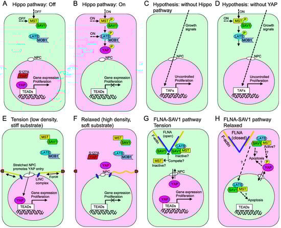 Hippo-dependent and -independent pathways for cell proliferation. The pink-colored nucleus indicates the localization of YAP1/TAZ in the nucleus, suggesting a cell growth state. Nevertheless, it has been reported that YAP1 nuclear localization alone is insufficient as an indicator of YAP1 activity (see Section 3). (A,B) The Hippo pathway can be turned off or inhibited by several mechanisms and factors, such as alterations in cell polarity, growth factors, oncogenic signaling, nutrient availability and metabolic signals. When the Hippo pathway is turned off, the core kinases of the pathway, particularly LATS1/2, become inactive. This leads to reduced or no phosphorylation of YAP1. Non-phosphorylated YAP1 then translocates to the nucleus and acts as a transcriptional co-activator. It binds to various transcription factors, most notably those in the TEAD family. This interaction triggers the activation of genes that promote cell proliferation and survival (resistance to apoptosis), as well as other genes involved in processes such as stem cell activation. The S127A mutant of YAP1 is resistant to phosphorylation and is retained within the nucleus [230]. The Hippo pathway is activated by various extracellular and intracellular signals, including G-protein-coupled receptor signaling, as well as signals downstream of cellular metabolism and CIP. These signals can influence the activity of the pathway’s core components, which include mammalian STE20-like protein kinases (MST1/2) and LATS1/2. SAV1, MOB1, and other factors also promote the kinase activity of their binding partners. Once activated, LATS1/2 phosphorylate YAP1/TAZ. When phosphorylated, YAP1/TAZ are retained in the cytoplasm and become subject to degradation. Normally, the Hippo pathway restricts growth by suppressing YAP1. However, oncogenes such as Ras and Src can either inhibit the Hippo pathway or directly activate YAP1, thus promoting uncontrolled cell growth and contributing to cancer development. (C,D) Hypothesis: Cells can proliferate through various growth signals even in the absence of the Hippo pathway or YAP1 (this can occur even when the Hippo pathway is active), potentially leading to uncontrolled growth. (E,F) Mechanical forces can influence YAP1 translocation into the nucleus independently of the Hippo pathway. YAP1 remains in the cytosol on soft substrates, even when its phosphorylation is inhibited, indicating that dephosphorylation alone does not ensure its nuclear entry. The stretching of NPC through mechanical forces and substrate stiffness, mediated by the LINC complex and actin cytoskeleton, plays a key role in YAP1’s nuclear import, which varies with substrate rigidity [62]. Nevertheless, it has been observed that the opening of the NPC alone is insufficient for the nuclear entry of YAP1 (see Section 3). (G,H) The binding of SAV1 to FLNA under tension retains MST1/2 and LATS1/2 in the cytoplasm, thereby endorsing the activity of YAP1 in the nucleus. In relaxed cells, SAV1 is released from FLNA to induce apoptosis by an unknown mechanism. Some of the released SAV1 might translocate to the nucleus, presumably with MST1/2 and LATS1/2. Phosphorylation of YAP1 might take place in the cytosol if non-phospho-YAP1 can exit the nucleus [225].