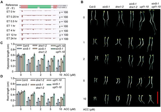 DNE1 positively regulates ethylene response in Arabidopsis. (A) The expression levels of DNE1 in etiolated wild-type Col-0 seedlings that were treated with ethylene gas (ET) at 10 μL/L for 0, 0.25, 0.5, 1, 4, 12, and 24 h. Illustration by integrated genome view (IGV) picture accessed on 1 January 2024 from EIN3 -Ethylene Chip-seq/RNA-seq browser, http://neomorph.salk.edu/dev/pages/EIN3.html), green box represents coding sequence (CDS), red box denotes untranslated region (UTR), gray line with arrowhead stands for gene direction. (B) Phenotypes of Col-0, ein5-1, dne1-2, ein5-1 dne1-2, upf1-10, ein5-1, and upf1-10 with or without 1-aminocyclopropane-1-carboxylic acid (ACC) treatment. Seedlings were grown on MS medium supplemented with 0, 1, 2, 5, 10 μM ACC at 22 °C for three days. Scale bar = 1 cm. (C,D) Quantification of hypocotyl lengths and root lengths of seedlings in (B). About 30 seedlings for each biological replicate were used, and three independent biological replicates were performed. Values are means marked with ±SD.