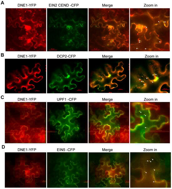 Membrane-less organelles, including P-bodies and stress granules, are usually formed in plant cells in response to a variety of environmental stresses, such as heat shock, low oxygen levels (hypoxia), salinity, and hyperosmolarity [,,]. When plants are exposed to ethylene, EIN2 associates with P-body components, including EIN5, UPF1, and PABPs, and targets EBF1/2 mRNA to P-body to subsequently inhibit the translation of EBF1/2 [,]. DNE1, which has been found to directly interact with UPF1 and DCP1 [,], is assumed to be present in P-body and related to EIN2 upon ethylene treatment. Therefore, we examined the subcellular allocation of DNE1, as well as its connection with EIN2 and P-body components. Here, we transiently co-expressed DNE1-YFP with EIN2 CEND-CFP, DCP2-CFP, UPF1-CFP, or EIN5-CFP into tobacco leaves. Upon ACC treatment, EIN2 CEND was induced to form cytoplasmic foci in P-body []. DNE1 was observed to co-localize with EIN2 CEND in cytoplasmic foci (Figure 2A). Although DNE1 only interacts with DCP1 but not DCP2 [], DCP2, which is localized in P-body and interacts with DCP1 [], showed co-localization with DNE1 (Figure 2B). In order to verify the identity of these condensates, we determined the subcellular localization of DNE1 and found co-localization between DNE1 and UPF1, and EIN5 (Figure 2B–D). This is consistent with the results of previous studies indicating that DNE1 was localized in P-body [,]. Minor signals of DNE1 were also observed in the nucleus, which is consistent with previous research, as the cytoplasmic membrane systems are connected to the nuclear envelope []. In conclusion, we found that DNE1 co-localizes with EIN2 and P-body components upon ethylene treatment, implying that DNE1 participates in ethylene signaling regulation.