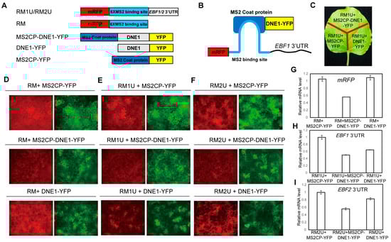 Next, we tested the mRNA level of EBF1/2 3′UTR and mRFP by qRT–PCR. Since the Kanamycin gene is driven by another 35S promoter in the same vector expressing RM/RM1U/RM2U, we used Kanamycin as the reference gene of qRT–PCR. As shown in Figure 3G, when RM was co-expressed with either MS2CP-YFP or DNE1-YFP, the expression levels of mRFP were comparable. Meanwhile, the abundance of mRFP was largely decreased when RM was co-expressed with MS2CP-DNE1-YFP. We also uncovered that the co-expression of RM1U/RM2U with MS2CP-DNE1-YFP led to a significant decrease in the abundances of mRFP compared to the combinations of RM1U/RM2U with MS2CP-YFP (Figure 3H). These results indicated that DNE1 was capable of suppressing the expression of genes tethered to it. Furthermore, when RM1U/RM2U was co-expressed with DNE1-YFP instead of MS2CP-YFP, the expression levels of mRFP were significantly reduced (Figure 3I). In line with the observations in Figure 3D–F, this finding suggests that DNE1 selectively suppresses reporter RNA expression levels by recognizing EBF1 and EBF2 3′UTRs.
