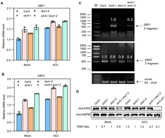 In order to verify the repressive effect of DNE1 on EBF1/2 mRNA, we detected mRNA levels of EBF1/2 in etiolated seedlings of Col-0, ein5-1, dne1-2, and ein5-1 dne1-2 grown on MS medium supplemented with and without 10 μM ACC. As shown in Figure 4A,B, EBF1/2 mRNA levels are higher in ein5-1 compared with Col-0, consistent with previous research [,]. EBF1/2 mRNA levels were slightly higher in dne1-2 than in Col-0. Meanwhile, EBF1/2 mRNA levels were significantly higher in ein5-1 dne1-2 than in ein5-1 (Figure 4A,B). These data are in accordance with the triple response phenotype in Figure 1B.