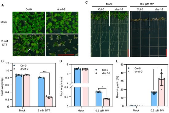 In plants, there are various types of RNases (ribonucleases) that play crucial roles in the processing and degradation of RNA, which are important for the regulation of plant growth and development, as well as the response to stress conditions [,,]. The dne1 mutant showed hypersensitivity to osmotic stress [], and the DNE1 overexpression line exhibited more tolerance to oxidative stress []. To better elucidate the biological roles of DNE1, we treated both wild-type and dne1-2 mutant plants with DTT (1,4-dithiothreitol) and methyl viologen (MV). DTT can disrupt the redox environment of the endoplasmic reticulum by interfering with the formation of disulfide bonds, thus causing endoplasmic reticulum stress [,]. The dne1-2 mutant showed hypersensitivity to DTT-induced ER stress with smaller leaves and lower fresh weight than Col-0 (Figure 5A,B). On the other hand, the dne1-2 mutant displayed hypersensitivity to MV-induced oxidative stress with shorter root lengths and a higher bleaching rate (Figure 5C–E), confirming the previously published data [,]. Overall, we found that DNE1 is involved in ER stress and oxidative stress, providing new insights for a comprehensive understanding of the biological roles of DNE1.