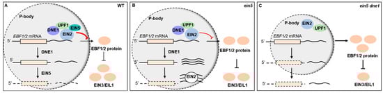 Taken together, the 3′UTRs of EBF1/2 transcripts recruit RNA processing factors including EIN2, EIN5, UPF1, and DNE1 to manipulate the abundance and translation of EBF1/2 mRNAs. DNE1, acting as a nucleic acid endonuclease, recognizes and cleaves the 3′UTRs of EBF1/2 mRNAs, thereby modulating the ethylene response through negatively regulating the abundance as well as the translation of EBF1/2 (Figure 6A). EBF1/2 proteins negatively regulate the key transcription factors EIN3 and EIL1; hence, DNE1 promotes the plant response to ethylene. In the ein5-1 mutant, the abundance of EBF1/2 mRNA is slightly higher than that in the wild type. DNE1 promotes the accumulation of 3′UTR fragments via its endoribonucleic activity. The over-accumulated 3′UTR fragments subsequently function as a molecular sponge to mitigate EIN2-mediated translation repression of EBF1/2 mRNAs (Figure 6B). In the ein5-1 dne1-2 double mutant, the abundance of EBF1/2 mRNA is higher than that in both wild-type Col-0 and the ein5-1 mutant. Meanwhile, the translational inhibition of EBF1/2 mRNA is further released. These allow EBF1/2 proteins to increase to a higher level and result in a more pronounced ethylene-insensitive phenotype (Figure 6C). Our findings are helpful for obtaining a deeper understanding of the molecular mechanisms of the ethylene signaling pathway in plants.