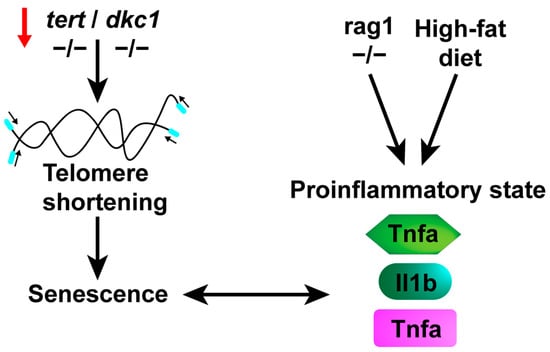 - Lex, K.; Maia Gil, M.; Lopes-Bastos, B.; Figueira, M.; Marzullo, M.; Giannetti, K.; Carvalho, T.; Ferreira, M.G. Telomere shortening produces an inflammatory environment that increases tumor incidence in zebrafish. Proc. Natl. Acad. Sci. USA 2020, 117, 15066–15074. [Google Scholar] [CrossRef] [PubMed]
