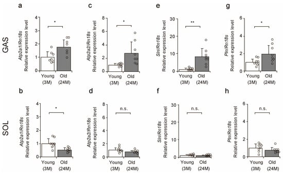 Comparison of the expression levels of sarcoplasmic reticulum calcium ion ATPase-related factors in skeletal muscle. Relative mRNA expression level of Atp2a1 (a,b), Atp2a2 (c,d), Sln (e,f), and Pln (g,h) in the gastrocnemius and soleus muscles. Data are presented as mean ± standard deviation, n = 7–8 per group. Significant differences between young and old mice were determined using Student’s t-test. ** p < 0.001, * p < 0.05. n.s.: not significant. All data are represented as dots in the graph. GAS, gastrocnemius muscle; SOL, soleus muscle; 3M, 3-month-old mice; 24M, 24-month-old mice.