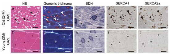 Histochemical findings and ectopic sarcoplasmic reticulum calcium ion ATPase (SERCA) immunoreactivity (IR). Serial cross-sections of the gastrocnemius muscles of old (a–c) and young mice (f–h) were stained with hematoxylin and eosin (HE), modified Gomori’s trichrome, and succinate dehydrogenase (SDH). These cross-sections were also stained with anti-SERCA1 or anti-SERCA2a antibodies in old (d,e) and young mice (i,j). Black arrowheads indicate spikes and lakes in the cytoplasm (a). White arrowheads indicate red materials in cytoplasm (b). Black arrows indicate ectopic SERCA IR (d,e). Asterisks denote identical muscle fibers. Scale bar = 50 μm. GAS, gastrocnemius muscle; 3M, 3-month-old mice; 24M, 24-month-old mice.