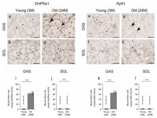 Dihydropyridine receptor alpha 1 (DHPRα1) and ryanodine receptor 1 (RyR1) localization. Cross-sections of the gastrocnemius (a,c,e,g) and soleus (b,d,f,h) muscles were stained with anti-DHPRα1 (a–d) or anti-RyR1 (e–h) antibodies. Asterisks indicate normal immunoreactivity (IR) in the cytoplasm and subsarcolemma of DHPRα1 or RyR1 (a,b,d–f,h). Arrows indicate muscle fiber with ectopic DHPRα1 or RyR1 IR (c,g). Scale bar = 50 μm. The number of muscle fibers with ectopic DHPRα1 or RyR1 IR was measured in the gastrocnemius (i,k) and soleus (j,l) muscles. Data are presented as mean ± standard deviation, n = 8 per group. Significant differences between young and old mice were determined using Student’s t-test. *** p < 0.0001. n.s.: not significant. All data are represented as dots in the graph. GAS, gastrocnemius muscle; SOL, soleus muscle; 3M, 3-month-old mice; 24M, 24-month-old mice.
