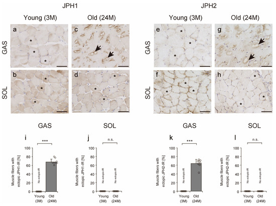 Junctophilin (JPH) 1 and JPH2 localization. Cross-sections of the gastrocnemius (a,c,e,g) and soleus (b,d,f,h) muscles were stained with anti-JPH1 (a–d) or anti-JPH2 (e–h) antibodies. Asterisks indicate normal immunoreactivity (IR) to JPH1 or JPH2 in the cytoplasm and subsarcolemma (a,b,d–f,h). Arrows indicate muscle fiber with ectopic JPH1 or JPH2 IR (c,g). Scale bar = 50 μm. The number of muscle fibers with ectopic JPH1 or JPH2 IR was measured in the gastrocnemius (i,k) and soleus (j,l) muscles. Data are presented as mean ± standard deviation, n = 8 per group. Significant differences between young and old mice were determined using Student’s t-test. *** p < 0.0001. n.s.: not significant. All data are represented as dots in the graph. GAS, gastrocnemius muscle; SOL, soleus muscle; 3M, 3-month-old mice; 24M, 24-month-old mice.