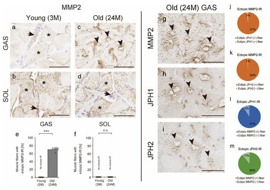 JPH is susceptible to degradation as a substrate for matrix metalloproteinase 2 (MMP2) [35]. In this study, the localization of JPH1, JPH2, and MMP2 in the TA was confirmed via IHC. First, in the young and old soleus muscles and young gastrocnemius muscles, MMP2 localization was observed in the cytoplasm (asterisks in Figure 8a,b,d) and extracellular matrix (arrows in Figure 8a,b,d). In contrast, in the old gastrocnemius muscles, MMP2 localization was observed ectopically in the contour of the TA (arrowheads in Figure 8c). The number of muscle fibers with ectopic MMP2 IR increased markedly in the gastrocnemius muscles of old mice (Figure 8e), but no such changes were observed in the soleus muscles (Figure 8f). In addition, JPH1 or JPH2 were, respectively, co-localized with MMP2 around the contours of the TA (Figure 8g–i). In fact, the concordance (ectopic JPH1 IR/ectopic MMP2 IR) and concordance (ectopic JPH2 IR/ectopic MMP2 IR) rates were 97% and 99% (Figure 8j,k). The concordance (ectopic MMP2 IR/ectopic JPH1 IR) and concordance (ectopic MMP2 IR/ectopic JPH2 IR) rates were 91% and 89% (Figure 8l,m). These results suggest that JPH1 or JPH2 co-localize with MMP2 around the TA.