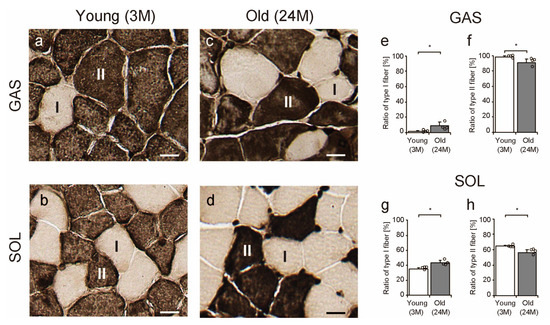 Ratio of type I and II fibers. Cross-sections of the gastrocnemius and soleus muscles were stained with myofibrillar adenosine triphosphatase in young (a,b) and old (c,d) mice. Lightly and darkly stained muscle fibers were classified as type I and type II muscle fibers, respectively. Scale bar = 10 μm. The ratios of type I and II muscle fiber were measured in the gastrocnemius (e,f) and soleus (g,h) muscles. Data are presented as mean ± standard deviation, n = 4 per group. Significant differences between young and old mice were determined using Student’s t-test. * p < 0.05. All data are represented as dots in the graph. GAS, gastrocnemius muscle; SOL, soleus muscle; 3M, 3-month-old mice; 24M, 24-month-old mice.