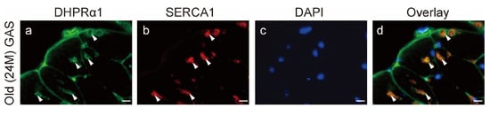 DHPRα1 and SERCA1 co-localization. Cross sections of the old gastrocnemius muscles were stained by anti-DHPRα1 (a) and SERCA1 (b) antibodies. DAPI was used for counterstaining (c). Arrowheads indicate representative localizations of DHPRa1 (a) and SERCA1 (b) in tubular aggregates (TAs), and arrowheads of overlay image shows representative co-localizations of DHPRa1 and SERCA1 in TAs (d). Scale bar = 10 μm. GAS, gastrocnemius muscle; 24M, 24-month-old mice.