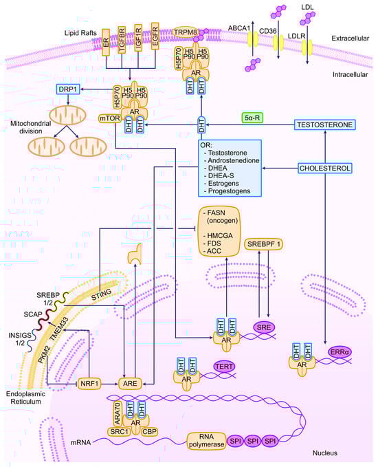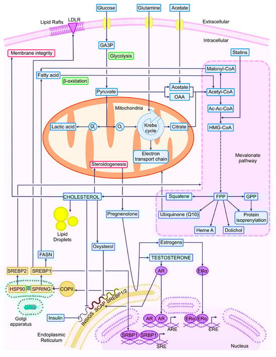 SREBP1 has been implicated in PCa cell proliferation, migration, and invasion. Studies have revealed that an AR/mTOR complex promotes SREBF1 expression and activity, primarily due to the constitutive activation of mTOR resulting from the loss of function of PTEN [79]. Moreover, the AR-SREBP1 axis has been identified, forming a self-regulating interaction between the activation of SCAP by AR and SREBP1, which subsequently increases the expression of AR [80,81]. Androgens are recognized as key activators of SREBPs under both physiological conditions and in steroid-regulated cancers [82]. One form of regulation occurs through the stimulation of SCAP expression [83], leading to a switch in the isoform expression of INSIG [84] and the upregulation of several enzymes involved in fatty acid and cholesterol synthesis under the transcriptional control of AR [13]. Perturbations in cholesterol metabolism have been predominantly identified in high-grade tumors [3]. Correspondingly, the inhibition of fatty acid synthase (FASN) enhances the immune response to castration-resistant PCa cell line tumors and decreases the expression and transcriptional activity of AR and the AR-variant splicing 7, resulting in a better response to hormone treatment [85]. The secretion of cholesterol into the intracellular space is regulated by ATP-binding cassette (ABC) transporters, and data have shown the tissue-dependent regulation of ABC transporters by estrogens, progesterone, and androgens [86].