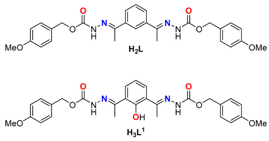 The Schiff base ligand H2L was synthetized according to the reaction between 1,3-diacetylbenzene and 4-methoxybenzylcarbazate (1:2 ratio), using a catalytic amount of p-toluensulfonic acid and absolute ethanol as the solvent. Once isolated, H2L was fully characterized using different techniques: melting point determination, elemental analysis, infrared spectroscopy, mass spectrometry and 1H and 13C NMR spectroscopy (Figures S1–S5, Supplementary Materials).