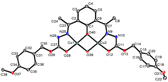The values of the bond distances (Table S2) between the metal centers and the imine nitrogen atoms, Cu(1)-N(25) and Cu(2)-N(9) [1.9105(19) and 1. 9145(19) Å, respectively], as well as the distances between the copper atoms and the amide oxygen atoms, Cu(1)-O(28) and Cu(2)-O(12) [1.9185(15) and 1.9524(15) Å], are in the order of those found in other complexes with Schiff base hydrazone ligands [30,33,34]. The bond distances of the copper atoms to the μ2-oxo oxygen atoms of the spacer [Cu(1)-O(40) and Cu(2)-O(40) 1.9234(15) and 1.9234(15) and 1. 9498(15) Å, respectively] and those for the μ2-OH bridge oxygen atoms [Cu(1)-O(39) and Cu(2)-O(39) 1.9104(17) and 1.9371(17) Å, respectively] are similar to those found in the literature for similar coordination environments [35,36,37,38].