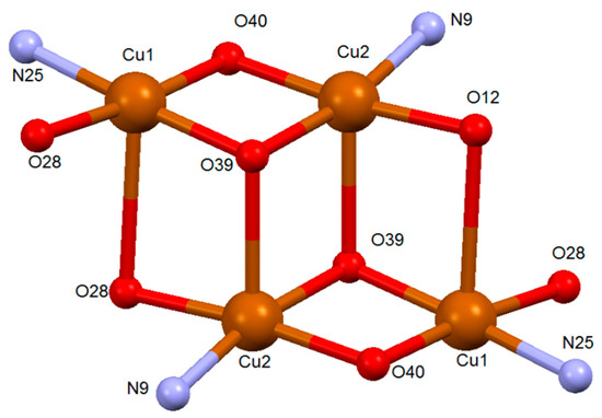 In the crystal structure of the [Cu2(L1)(OH)]·2CH3CN complex (Figure 5), the ligand molecules are arranged in an antiparallel fashion, leading to the formation of a pseudo-cubic Cu(II) ion cluster (Figure 6), as previously found in the literature in several papers, where these types of hydroxo:phenoxo bridges connect two Cu(II) ions [37,40,41,42].