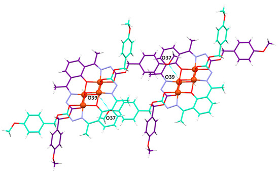 In the crystal lattice of the [Cu2(L1)(OH)]·2CH3CN complex, intermolecular hydrogen bonds are established between the methoxyphenyl groups on each pseudo-tetramer and the μ2-OH group of a neighboring tetramer. These interactions result in the 3D packing of the tetramer chains (Figure 7).