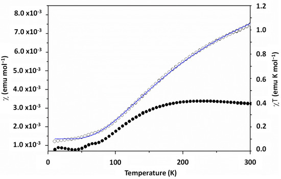 Dependence of χ (black, left axis) and χT (blue, right axis) on T/K for the [Cu2(L1)(OH)] complex.