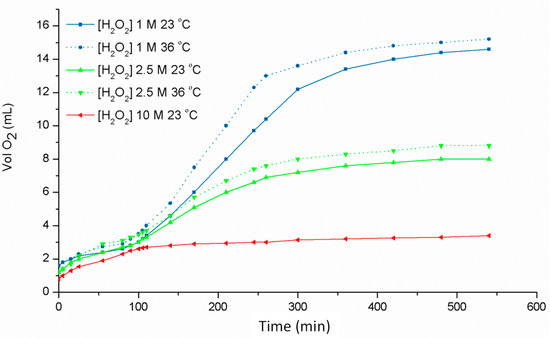 Table 1 shows the data obtained on the oxygen released and the number of catalytic cycles for the catalase reaction under the different experimental conditions. All the measurements were performed in triplicate, and the limits of error derived from the different measurements are detailed in the table. The reaction is finished after 600 min since, after this time, no dioxygen evolution is observed. Figure 9 shows the evolution of the oxygen released in the first 580 min of the process using different concentrations of hydrogen peroxide (10, 2.5 and 1 M) at 23 °C and 36 °C.