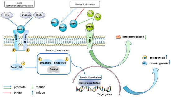 Bone morphogenetic protein (BMP) signaling functions rely on TGFβ superfamily ligands, type I and type II BMP receptors, and canonical drosophila mothers against decapentaplegic protein (Smad) downstream pathway []. It has been extensively investigated in the field of bone biology. Although several BMPs are expressed spatiotemporally in bone and act as essential motivators in bone developmental and regenerative processes, BMP2 has a unique role in PDPCs, and thereby regulates BMP signaling inducing periosteal bone formation, growth, and fracture repair. Neither absence of other BMPs such as BMP4, BMP7, and BMP9 [] nor BMP2 loss in mature osteoblasts causes spontaneous fractures []. Yet, both BMP2 and BMP4 expressions are increased and activate osteogenesis when PDCs respond to mechanical stretch, along with reduction in BMP6 expression []. BMP6 is related to the expression of IL1β and IL6, which are involved in RANKL-dependent osteoclastogenesis and bone resorption []. This might represent a special profile of mechanical stress-driven bone remodeling.