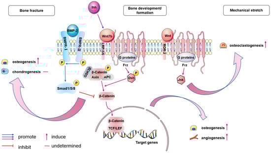 BMP2 signaling is also essential for the initiation of fracture healing [,]. A transgenic BMP2-deficient mouse model showed that local expression of BMP2 played a critical role in osteogenic and chondrogenic differentiation of PDPCs during repair, which eventually induced robust periosteal bone/cartilage callus formation [,]. The same conclusion was verified in bone autograft healing [] (Figure 1).