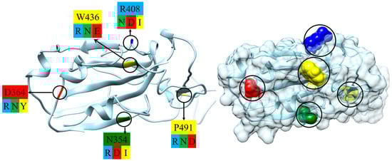 The electric charge of the protein globule is determined by the pH-dependent ionization of the amino and carboxylic groups of the amino acid residues located on the surface of the globule or in the pocket where they make contact with the water environment. In the second rows of Figure 3, Figure 4, Figure 5, Figure 6 and Figure 7, the substituted (the first pictures) and the substituting (the second, third, and fourth pictures) amino acid residues are colored according to their charge and hydrophilicity: green (uncharged hydrophilic); red (negatively charged hydrophilic); blue (positively charged hydrophilic); and yellow (uncharged hydrophobic).