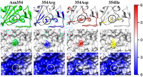 At mutation N354R (N1 in Table 2), the strong positive local electrostatic potential increases due to the substitution of the neutral asparagine residue with the positively charged arginine (the pictures Asn354 and 354Arg in the third row in Figure 3). As a result, the 3D structural stability of the S1-subunit expectedly decreases (reduced absolute value |ΔΔGfold|, positive increment ΔΔGfold, Table 3) because of the stronger electrostatic repulsion between the neighboring coulomb charges.