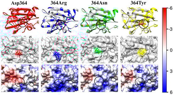 The same as in Figure 3 but in cases when the negatively charged hydrophilic amino acid residue of aspartic acid (aspartate, Asp, D) at 364th position in the wild-type RBD (the left column Asp364) is substituted with mutant residues of arginine (Arg, R; positively charged hydrophilic; the second column 364Arg), asparagine (Asn, N; uncharged hydrophilic, the third column 364Asn), or tyrosine (Tyr, Y; uncharged hydrophobic; the fourth column 364Tyr).