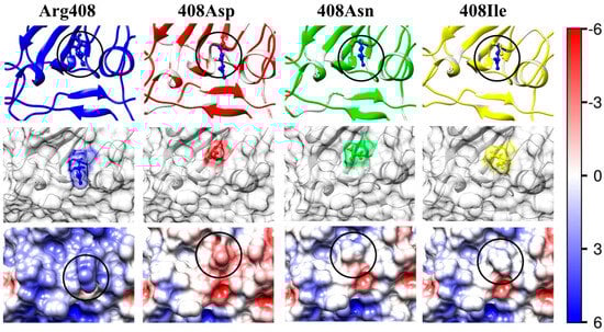 Upon substitution of the positively charged arginine residue (the Arg408 column in Figure 5) with the negatively charged aspartate residue (mutant R408D, N7 in Table 2), or with the neutral asparagine (mutant R408N, N8), the local electrostatic potential changes its sign from slightly positive to slightly negative or neutral, respectively (the columns 408Asp and 408Asn). This should lead to an increase in the 3D structural stability of the S1-subunit, but the decrease in the absolute value |ΔGfold| of the folding free energy (positive ΔΔGfold, Table 3) disproves this expectation. These last two point mutants reveal that, with small changes in the local electrostatic potential, it is not the leading factor determining the 3D structural stability of the protein globule.