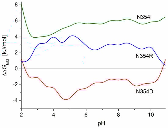 At the point mutant N354I, the hydrophilic asparagine residue is substituted with the hydrophobic isoleucine (the difference in ΔGtrans is ΔΔGtrans = +13.3 kJ/mol, N3 in Table 1). This is the clearest case because both amino acid residues are uncharged and have equal molecular volume Vres (the third factor which can contribute to the 3D structural stability of the protein globule). The decreased absolute value |ΔGfold| of the folding free energy (N3 in Table 3) and the positive ΔΔGfold values of the pH-curve N354I (Figure 8) confirm the expectation that the 3D stability of the S1-subunit should decrease as a result of the substitution of a hydrophilic with a hydrophobic amino acid residue (when they are located on the surface of the protein globule). The higher ΔΔGfold values of the curve N354I in comparison with N354R (Figure 8) indicate that the appearance of the hydrophobic uncharged isoleucine 354I residue on the hydrophilic surface of the S1-subunit (the pictures 354Ile in Figure 3) decreases the 3D structural stability of the protein globule to a greater degree than the substitution of the positively charged hydrophilic arginine residue 354R located in a region with a positive local potential (354Arg, Figure 3).