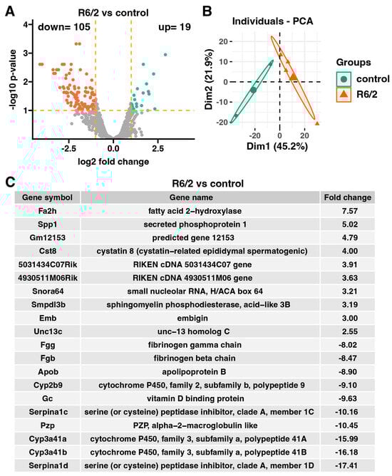 The disrupted expression of ApoB and Apoa1 is currently the focus of extensive analysis efforts in HD patients []. Several studies suggest that changes in lipid composition and lipoprotein metabolism disruptions play a role in the underlying HD pathomechanisms []. Our study indicates that the expression level of both apolipoproteins was suppressed (fold change: −8.9, and −5.2, respectively) in the R6/2 mouse model. Chang et al. showed that plasma levels of ApoB and ApoA1 were significantly reduced in symptomatic and presymptomatic HD patients [].