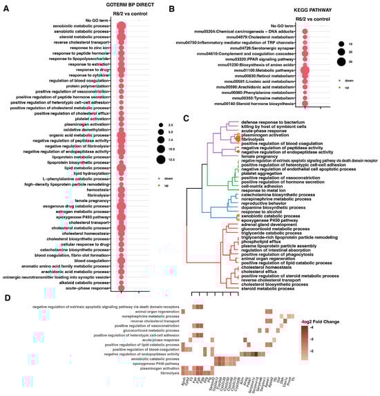 (A,B) Bubble plots representing differentially regulated gene ontology group from the DAVID GO BP DIRECT database. Columns present down-regulated gene sets represented by red bubbles. No statistically significant up-regulated ontological terms were found (green bubbles). The bubbles’ size is correlated with the number of genes in the particular gene set. The criterion used for qualification of GO terms is an adj p-value < 0.05. (C,D) Enrichment analysis of ontological terms using the GeneTonic library. (C) Dendrogram illustrating four clusters of differentially regulated gene sets. The size of dots placed by the GO term negatively correlates with the p-value, while the color positively correlates with the z-score. (D) Heat map representing differentially regulated genes from the 15 processes with the lowest p-values from plot C. Various shades of brown indicate a fold change.