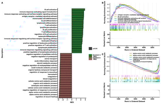 To analyze gene sets that were either enriched or depleted in the adrenals of the R6/2 mouse model compared to the genetic background control, we performed gene set enrichment analysis (GSEA). For all genes, we calculated an enrichment score (ES) for each gene set based on Gene Ontology (GO). Then, we calculated the normalized enrichment score (NES) based on each gene set’s size. Subsequently, we grouped gene sets from the highest to lowest NES and identified the 20 most enriched and depleted gene sets (Figure 3A). The majority of these sets are responsible for processes involved in the immune system. Additionally, we performed running enrichment score analyses for the five most enriched and five most depleted gene sets (Figure 3B,C).