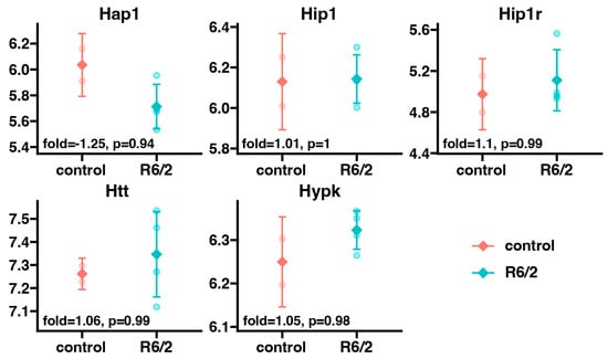 Finally, we checked the expression of endogenous huntingtin and its related genes in the R6/2 model compared to the genetic background control. For this purpose, we extracted the expression of Htt and Htt-related genes from the microarray data, and compared these results obtained from the R6/2 group to the genetic background control group (Figure 4). We observed no significant changes in the expression levels of the studied genes in the adrenals from the R6/2 group compared to the genetic background control. This result indicates a lack of impact of endogenous HTT transcripts in the R6/2 model on the expression of these genes. At the same time, it proves that these changes in gene expression were not caused by potential changes in endogenous Htt or Htt-related gene expression but by exogenous mutant HTT fragments.