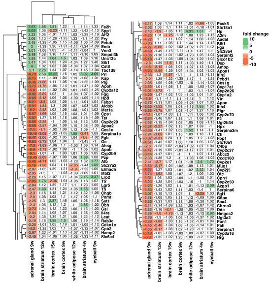 To investigate whether changes in expression profiles exhibit tissue specificity, we retrieved transcriptomic data from R6/2 mice and their corresponding controls for various organs. The data were obtained from the Gene Expression Omnibus (GEO) repository, utilizing selection conditions for expression profiling by array specific to R6/2 mice (Table 1). The tissue-specific data presented in the table below were employed for subsequent analysis. For each comparison, samples from the control and test groups were identified using GEO2R software []. Subsequently, the generated R code was utilized to select genes corresponding to those differentially expressed in R6/2 adrenal glands. This procedure involved merging the resulting tables based on gene symbols. Genes whose symbols were absent in at least three datasets were excluded from the final table. The outcome of this operation was a table containing fold change values. The resulting data were visualized as a heatmap, accompanied by hierarchical clustering applied to both columns and rows.