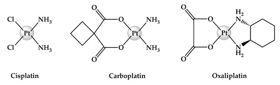 The classical cytotoxic platinum(II) drug, cis-diammineplatinum(II) dichloride (cisplatin) and its direct analogues, trans-L(1R,2R-diaminocyclohexane) oxalatoplatinum(II) (oxaliplatin) and cis-diammine(1,1-cyclobutanecarboxylato)platinum(II) (carboplatin) (Figure 1), are a class of square planar platinum(II) anticancer drugs, which have irrevocably evolved as working pillars of chemotherapy [1,2,3,4,5]. The potency of platinum(II) drugs is demonstrated through their ability to induce deoxyribonucleic acid (DNA) lesions by covalently binding to DNA [6]. Consequently, DNA replication and transcription are effectively ceased, which induces apoptosis [7]. It is also noteworthy that while DNA is the therapeutic target of these drugs, inevitably, they also exhibit non-specific binding with phospholipids, thiols, ribonucleic acid, and other biomolecules that contain nitrogen, sulfur, and oxygen atoms [8,9,10]. Unfortunately, this singularity reflects the non-selectivity of the drugs resulting in decreased therapeutic efficacy and increased incidence of pernicious side effects, which patients commonly experience when receiving platinum-based regimens [11,12,13,14,15]. Furthermore, drug resistance is another clinical limitation associated with the use of platinum(II) drugs, which often develops when treatment is prolonged [16,17]. Because of this, combinatorial treatment is employed, wherein therapeutic agents are administered together with platinum(II) drugs in an attempt to enhance treatment effectivity [18]. However, this type of regimen can complicate patient care and interfere with therapeutic outcomes since each co-administered agent has a unique pharmacokinetic index [19,20].
