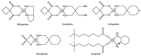 Cisplatin, oxaliplatin and carboplatin are effective anticancer agents. Regrettably, their disadvantageous traits proved to be burdensome to patients, and thus it is only ethical to develop safer chemotherapeutic alternatives that can improve cancer treatment experience. Many platinum-based complexes have been previously synthesised and investigated in the hope of finding another chemotherapeutic agent that is as potent as cisplatin, but without the toxic side effects, and has the potential to circumvent chemoresistance [21,22,23,24]. Some examples include zeniplatin [25], spiroplatin [26], enloplatin [27], aroplatin [28] and miboplatin [29] (Figure 2). These third-generation platinum(II) complexes were in clinical trials, but were eventually withdrawn either because of demonstrated severe toxicity or limited antitumour activity.