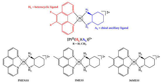 A collection of structurally related platinum(II) complexes have also been investigated and numerous studies have confirmed their impressive biological activity against multiple human cell lines [30,31,32,33,34,35]. The chemical structures of these complexes are represented as [PtII(HL)(AL)]2+, where HL is a bulky heterocyclic ligand (i.e., 1,10-phenanthroline (phen), 5-methyl-1,10-phenanthroline (5-Mephen) or 5,6-dimethyl-1,10-phenanthroline (5,6-Me2phen)) and AL is a chiral ancillary ligand (i.e., 1S,2S-diaminocyclohexane (SS-DACH or DACH)). [PtII(phen)(SS-DACH)]2+ (PHENSS), [PtII(5-Mephen)(SS-DACH)]2+ (5MESS) and [PtII(5,6-Me2phen)(SS-DACH)]2+ (56MESS) are three notable examples from this class (Figure 3). 56MESS has proven to be the most potent and has been reported to promote epigenomic changes by interfering with the cytoskeleton, cell-cycle proteins, mitochondria, and nuclear DNA [36,37]. Despite the remarkable in vitro activity of 56MESS, preliminary in vivo studies indicated that the drug was ineffective in suppressing tumour on BD-IX rats with peritoneal carcinoma and caused nephrotoxicity [38]. Intriguingly, when PHENSS was administered on mice with prostate tumour, no toxicity was detected and the rate of tumour regression was comparable to cisplatin [32]. To further elucidate this irregularity, the equivalent platinum(IV) derivatives of the complexes were synthesised and investigated, with preliminary evidence showing an enhancement in pharmacokinetic and pharmacological properties [39,40].